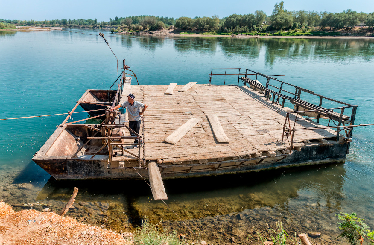Trasferendoci nella regione di Namangan, nel villaggio di Gurumsaray abbiamo fotografato il traghetto e il pontile galleggiante sul fiume Syr Darya, che in autunno non funziona a causa del basso livello dell’acqua nel fiume.