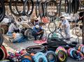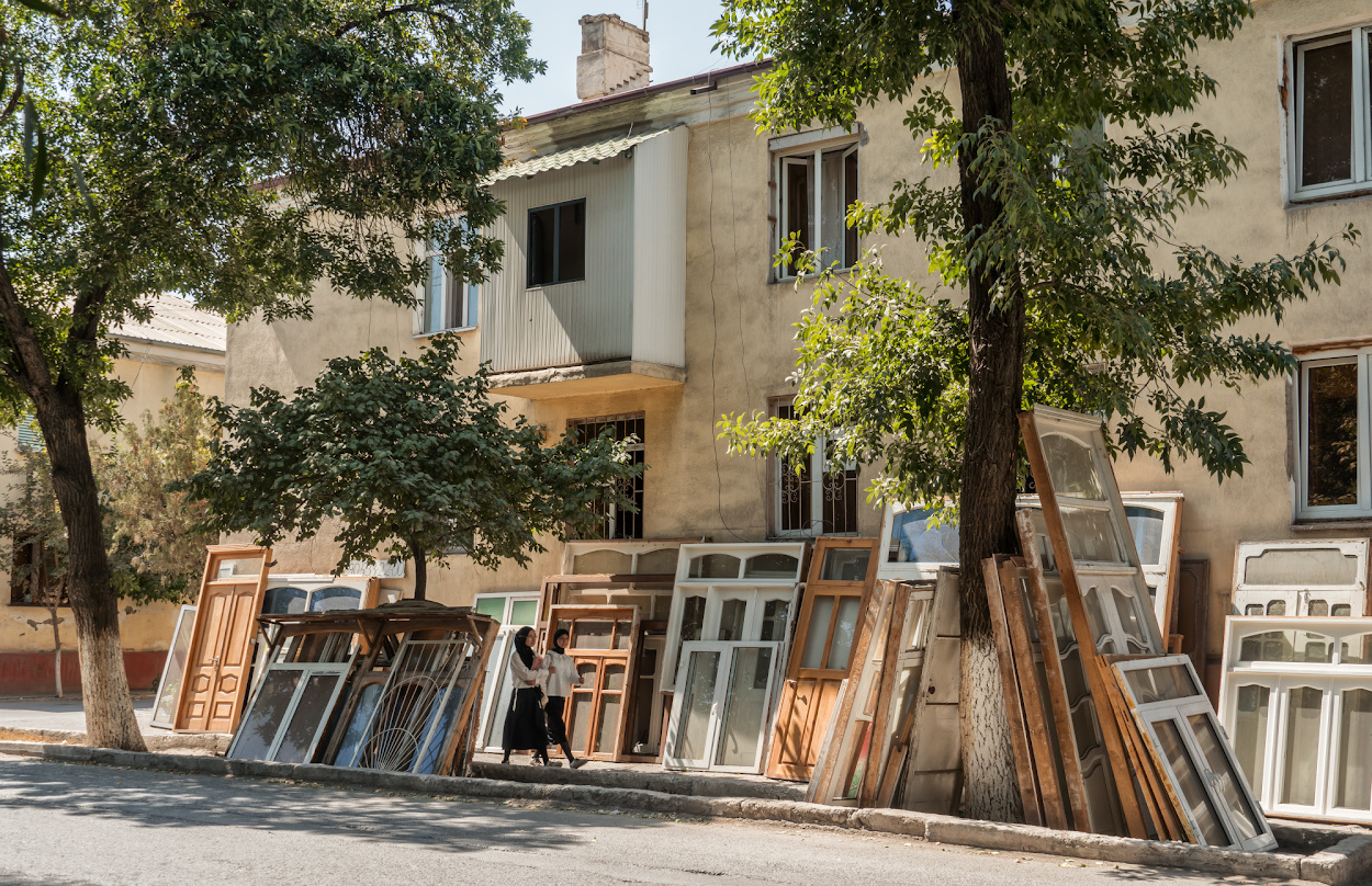 La nostra prima sosta a Margilan è stata in una strada dove si vendono finestre e porte, sia moderne con profili in plastica, sia usate, forse recuperate da edifici demoliti. È stato uno spettacolo impressionante.