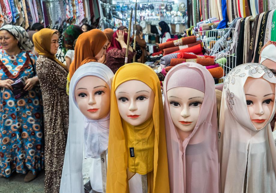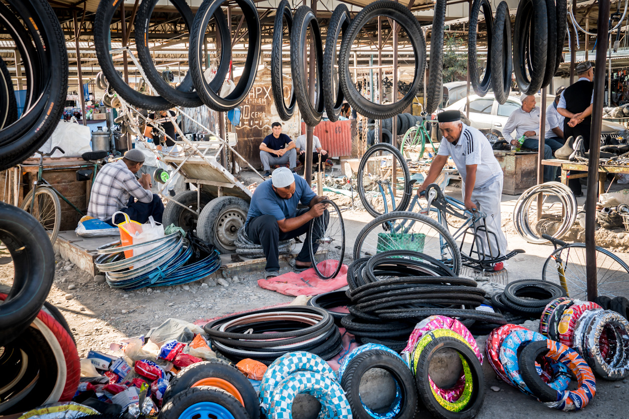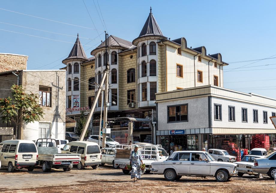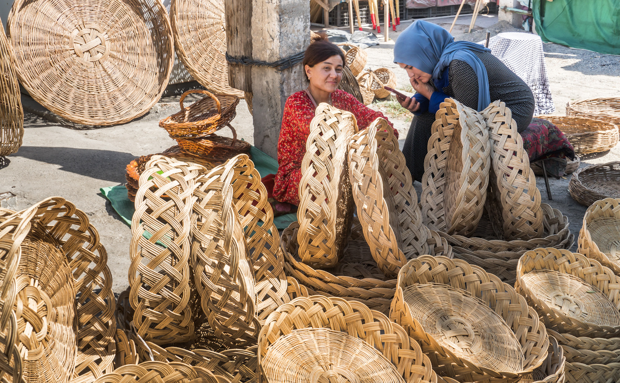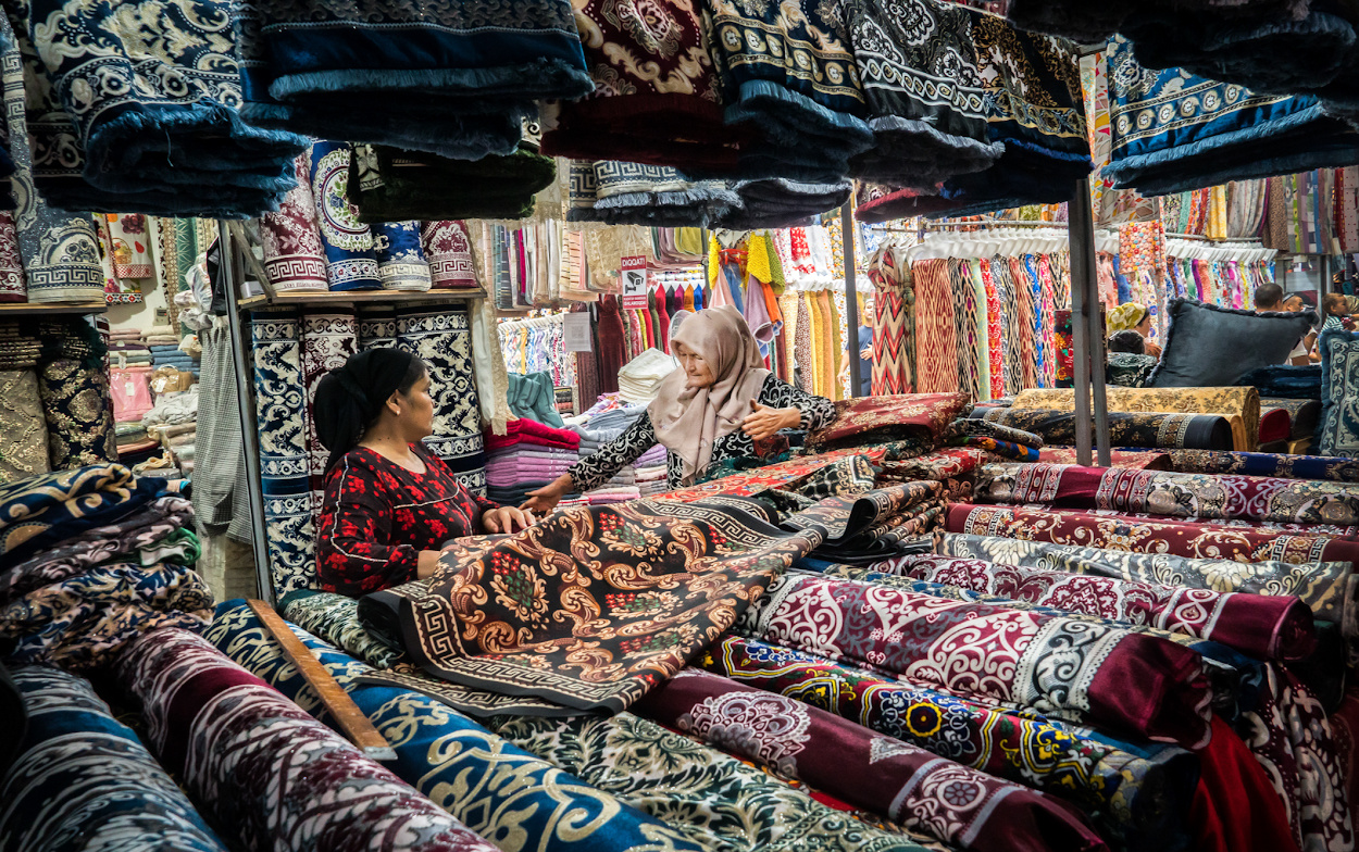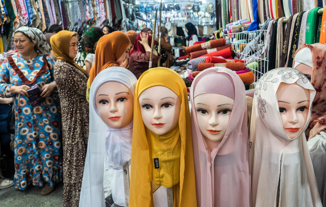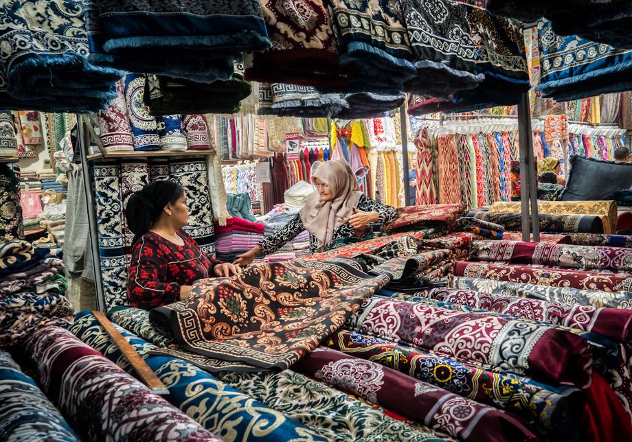 Successivamente siamo andati al grande mercato «Kombinatsky». Qui si vendono tessuti prodotti nelle manifatture di seta locali, ma non solo. Tappeti, abbigliamento, biancheria da letto, prodotti alimentari e articoli per la casa si mescolano caoticamente in una strana tavolozza che dà quasi mal di testa.