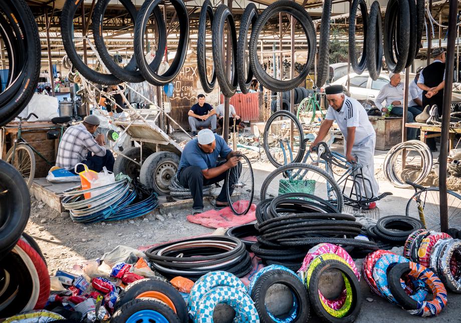 La mattina seguente, lasciata la Chevrolet noleggiata nel parcheggio, abbiamo preso un taxi e siamo andati nella periferia di Margilan, nel villaggio di Kumtepa, al mercato di Kushtapin (quelli sono i toponimi locali). Anzi, a una sorta di agglomerato di mercati che comprende: mercato dei mobili, mercato dei prodotti in legno e del legname, mercato dell’abbigliamento «Faiz», mercato delle stoviglie, mercato delle biciclette e dei pezzi di ricambio per biciclette, mercato dei kazan (calderoni), mercato di argilla, mercato alimentare dei contadini e così via, e così via…
