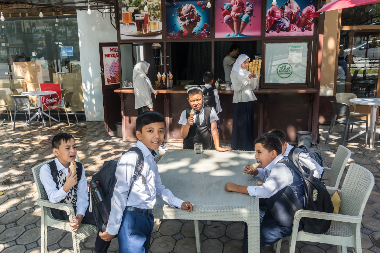 Abbiamo mangiato con piacere un gelato in compagnia di studenti locali, notando anche una caratteristica evidente della vita quotidiana. Nel traffico di Margilan il trasporto a due ruote svolge un ruolo molto importante. Non si tratta di motociclette, ma principalmente di biciclette, oltre a ciclomotori, motorini e scooter. La probabile spiegazione sta nel terreno completamente pianeggiante della parte centrale della Valle di Fergana, che rende questo mezzo pratico per spostarsi e trasportare merci. Nel caos dei mercati locali e nelle strette vie attorno a essi, biciclette e scooter sfrecciano agili come piccoli pesci in una corrente tumultuosa.