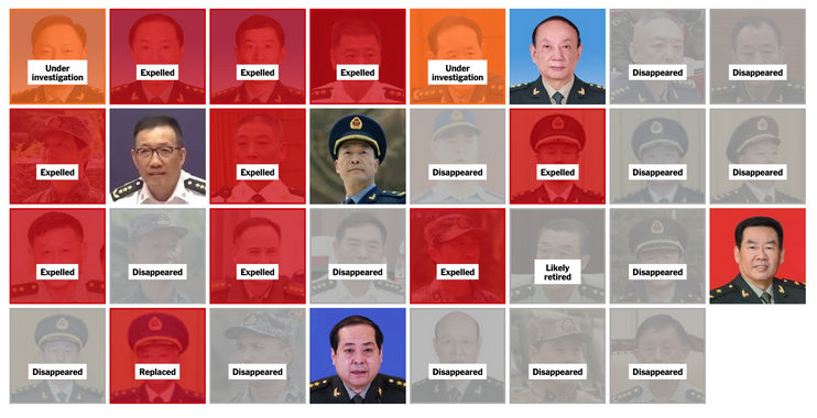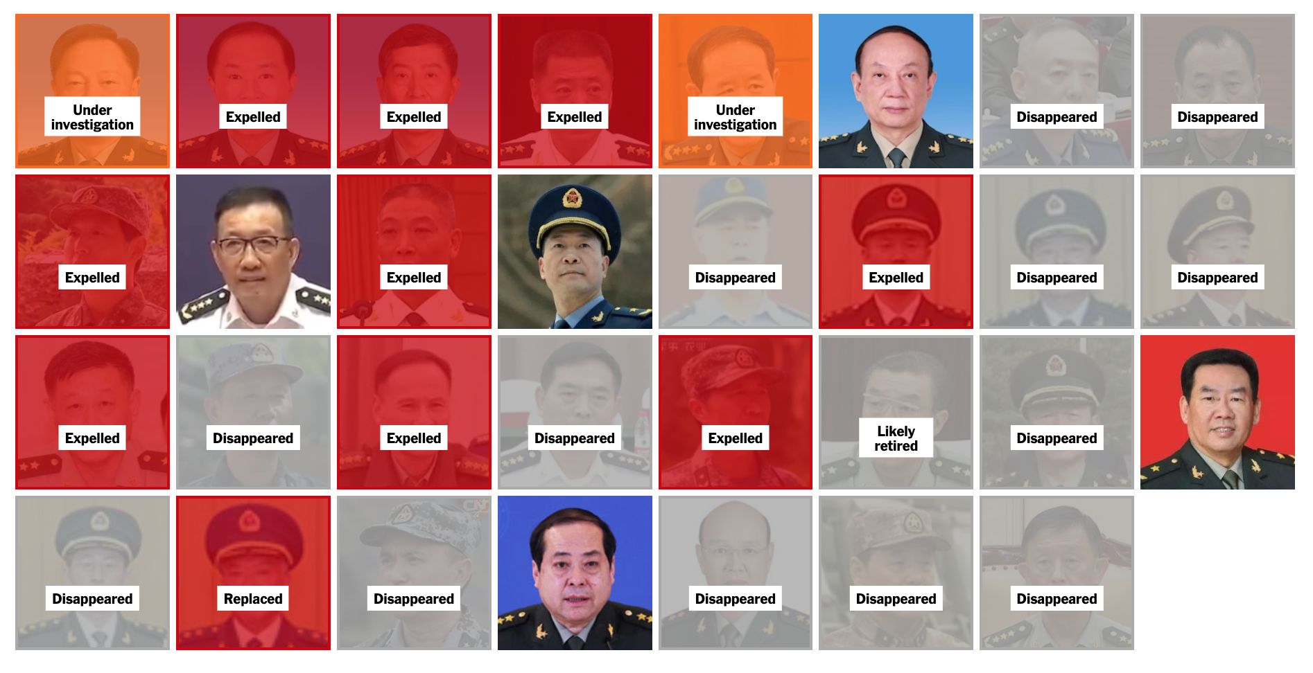 Dall'inizio del 2023, su 30 alti generali e ammiragli, solo sette hanno mantenuto le loro posizioni, mentre gli altri sono stati mandati in pensione o sono di fatto «scomparsi» dalla scena pubblica, ha calcolato The New York Times sulla base di notizie dei media statali cinesi e dichiarazioni ufficiali. L'ultimo episodio è stato l'apertura di indagini contro il primo vicepresidente di Xi Jinping nella Commissione Militare Centrale, Zhang Youxia, e il capo dello stato maggiore congiunto della commissione, il generale Liu Zhenli, ufficialmente sospettati di «gravi violazioni della disciplina e della legge».